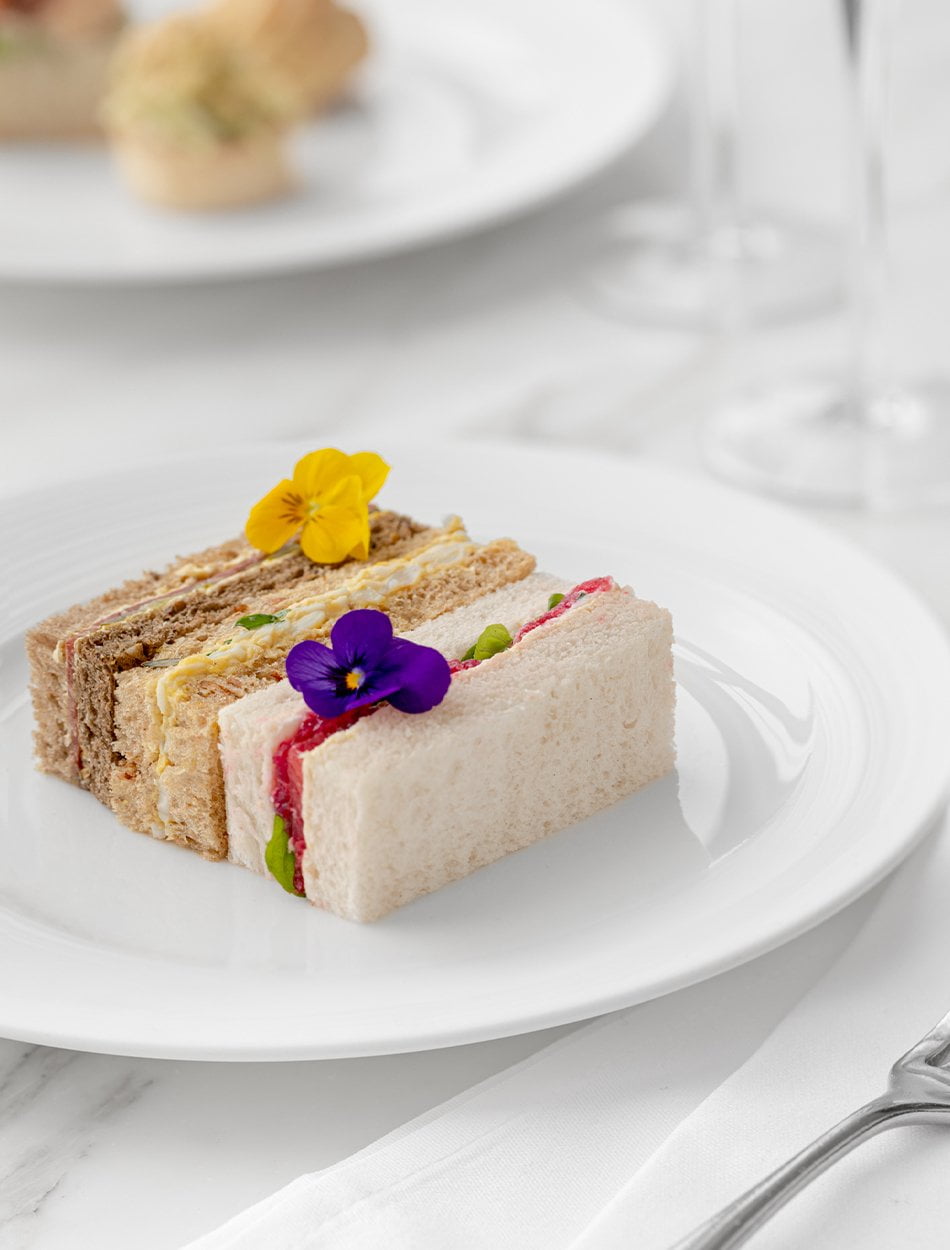 There is a difference between needs and wants and the experience doesn’t end with those exquisite scones. Petite and perfectly formed, an array of crafted pastries awaits. The Jubilee Tart, in celebration of Her Majesty’s Platinum Jubilee, is a glistening confection. The blueberry mirror glaze shines like a purple sapphire and although it does look too pretty to eat, my sweet tooth needs to be satisfied. The crumbly pastry bottom combined with the silky lime curd filling and fruity blueberry glaze is luscious.